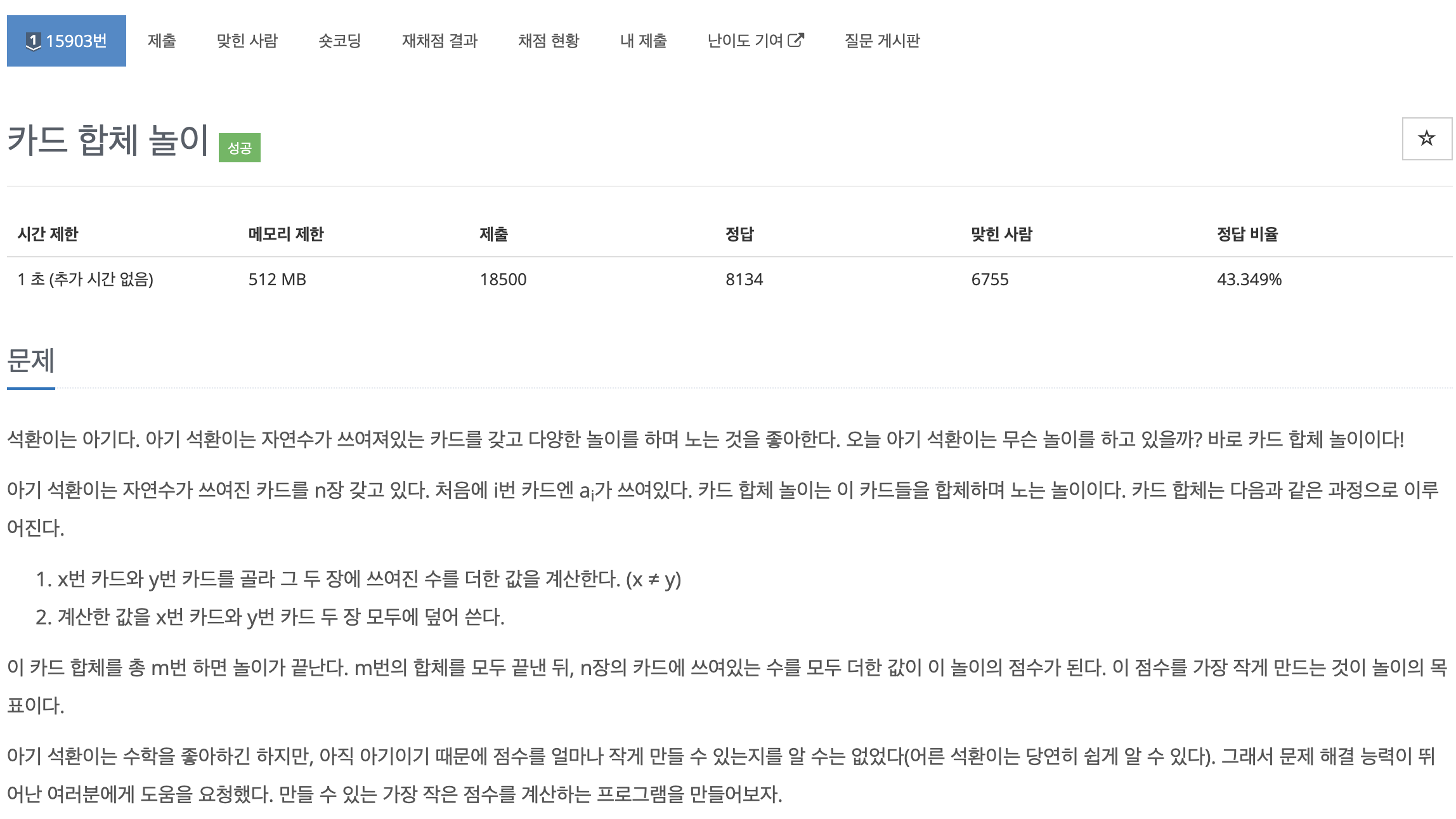 카드가 겹쳐지며 계속 사용되는 구조이다. 따라서 합이 최소가 되기 위해서는 작은 카드들이 최대한 많이 쓰여야한다.